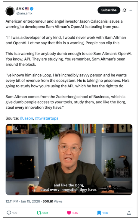 Jason Calcanis recently was interviewed and discussed the issue of centralized AI companies and how they plan to steal customers data. In the post, Calcanis states that they are seeking to absorb all the content through the AI and steal your ideas.