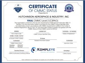 “Hutchinson’s CMMC Level 2 certification affirms our continuing leadership and our long-standing commitment to national security,” said Robert Anderson, EVP, Hutchinson Aerospace & Industry, Inc. “This milestone strengthens trust with our customers and ensures Hutchinson remains ready to support critical defense programs without compromise.”